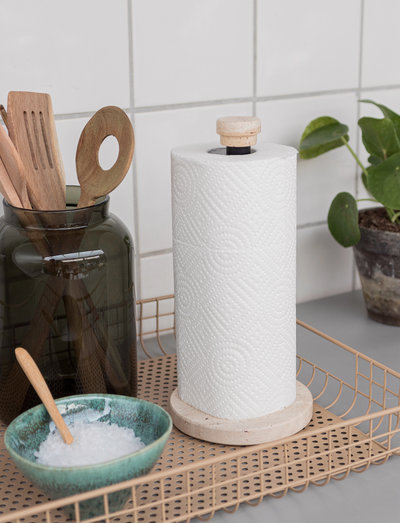The TRAVERTIN kitchen roll holder from Mette Ditmer beautifully combines functionality and aesthetics. Designed with a base and knob in travertine, the stones natural patterns and unique texture bring a warm and organic look to your kitchen. The sleek rod is crafted from black powder-coated metal that complements the natural colour tones of the travertine. The holder's sturdy construction and heavy base ensure stability and make it both practical and elegant.