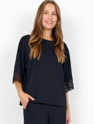 D'élégantes finitions en dentelle sur les manches rehaussent ce T-shirt classique. Confectionné dans un mélange de modal, de polyester et d'élasthanne, il offre une coupe confortable et souple. L'encolure ronde complète le design, ce qui le rend idéal à porter avec un jean ou un pantalon élégant.