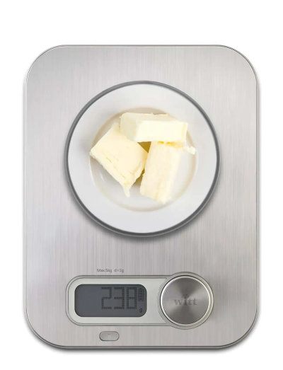 The Witt Premium Kitchen Scale in brushed steel offers a sleek, modern design perfect for any kitchen. Its battery-free operation is both eco-friendly and convenient. Simply turn the knob a few times to generate the energy needed for precise measurements, ensuring effortless and reliable weighing every time.