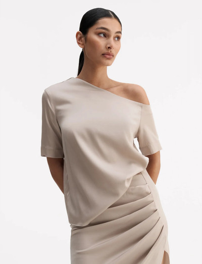 Þessi stutta ermablúsa er úr blöndu af silki og teygju og er með af-öxl sniði og útsaumssaum meðfram hryggnum. Georgette efnið fellur fallega, sem gerir það tilvalið fyrir kvöldverði.