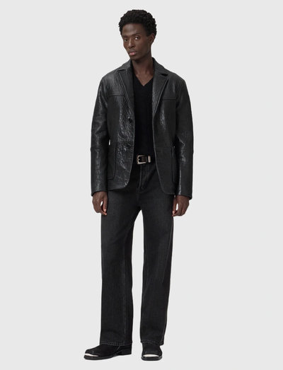 Þessi blazer er gerður úr áferðarmiklu leðri og býður upp á áberandi útlit með tveggja hnappa lokun og haklaga kraga. Hönnunin inniheldur vasalokur að framan og bætir við snert af klassískri sniðagerð við nútímalegt snið. Fjölhæfur flík sem hægt er að klæða upp eða niður.