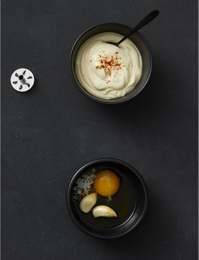 bamix® accessories. Whisk blade for everything that should be creamy. Blends pancake batter, puddings and salad dressings. Purées mashed potatoes in no time at all. Whisk your own mayonnaise without the use of additives. Perfect for quickly mixing cocktails.