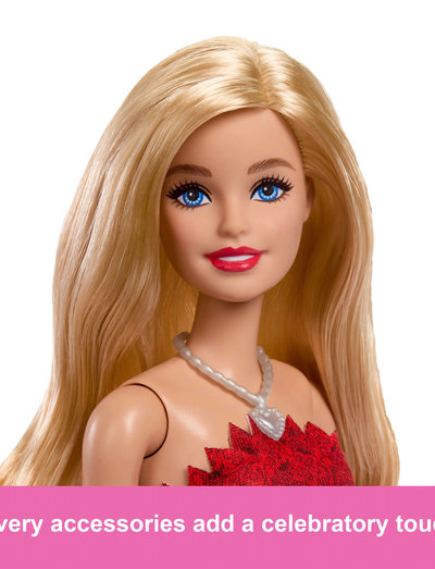 The Barbie brand marks Mattel's 80th anniversary with a collectible doll in a celebratory look! Barbie doll honors the company's long legacy of play in a ruby-red party dress with beautiful details, like a festive bow and a bodice featuring a design inspired by the iconic toy company logo. Silvery heeled sandals and a matching necklace complete her look. Barbie fans and kids ages 3 years and older will love celebrating this special occasion alongside this collectible doll. Doll cannot stand alone. Colours and decorations may vary.