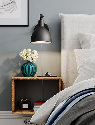 The bazar mini wall lamp is a new addition to the bazar family. a smaller and more easily placed model that goes well both in the bedroom as a reading light or kitchen as an extra lamp over the cookery books. the lamp is available in black, grey and white, with an on-off switch on the lampshade. the lamp’s head is adjustable.