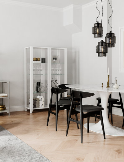 This pendant light is perfect if you only have one socket in your ceiling but would like more than one lamp shade hanging down for an exclusive impression and good lighting. ebbot pendant light cluster has three lamp shades in glass with one luxury black, twisted cord in textile each, hanging down from a collected roof cover. the roof cover is a round plate á 30 centimeters in a stylish black metal. all three glass shades are the same size and has a diameter á 40 centimeters. you are free to choose if you’d like the shades to hang down in a row or have different length for each. for ebbot pendant light cluster 3-lite, you need three light sources with e27 fiting. we recommend you to choose a light source in amber colour for most beautiful light. ebbot is available in two colours; amber for a softer tone and smokegrey for a tougher impression. ebbot is also available as a single pendant light in two different sizes for you who have a smaller space or would like a simpler pendant light. this pendant light is adjustable in height but has a maximum of 155 centimeters.
