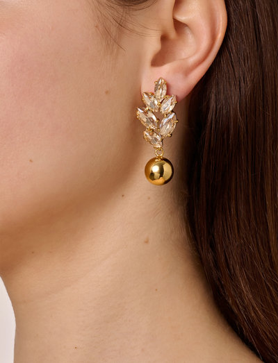 Þessir eyrnalokkar eru tilvaldir fyrir veislur og sérstök tilefni og eru með laufblaðalaga topp sem er skreyttur glitrandi, navette-skornum kristöllum. Glansandi gullfiskur hangir fyrir neðan og fullkomnar glæsilega hönnunina. Þessir eyrnalokkar eru hannaðir í Danmörku og eru lausir við nikkel, kadmíum og blý.