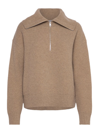 Þykk prjón og stór kragi einkenna þessa peysu með hálfum rennilás. Rennilásinn úr silfurlituðum málmi gefur klassísku sniðinu nútímalegt yfirbragð, en hálfpatentprjónið veitir hlýju og áferð.