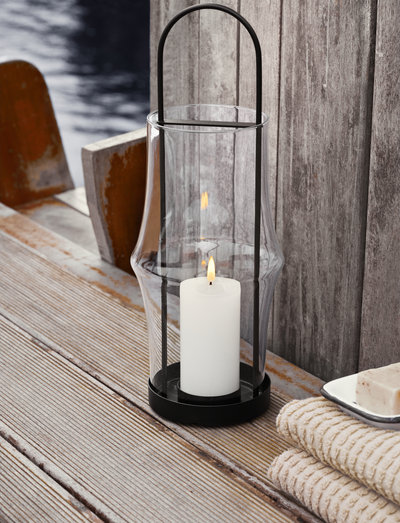 The elegant arc lanterns from holmegaard create a cosy atmosphere both indoors and outdoors with their unique design that reflects the light beautifully. the 25cm lantern is made from mouthblown borosilicate glass and is designed to hold a tealight or small pillar candles measuring a maximum of 6 cm in height and 4 cm in diameter. a metal plate at the bottom of the lantern keeps the candle stable and secure. and the metal plate at the top protects the handle from the heat of the flame while stabilising the glass as you carry the lantern. for example, place one or more lanterns on the table, on the window sill, by the stairs, on the floor or on the terrace. they can be used both indoors and outdoors, depending on the look you want to create.