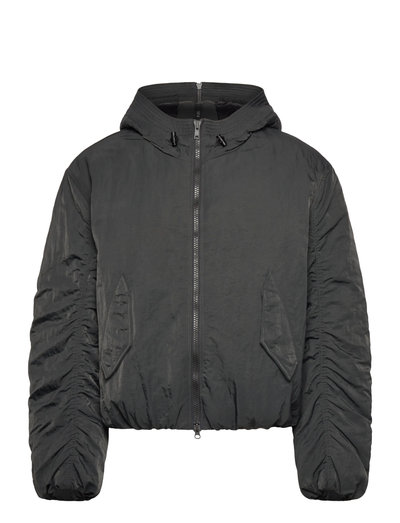 Þessi hettujakki er gerður úr léttu efni og er með áberandi rykkingum á ermunum. Hann er fjölhæft lag fyrir breytilegt veður og býður upp á þægilega passform og slétt, nútímalegt snið.