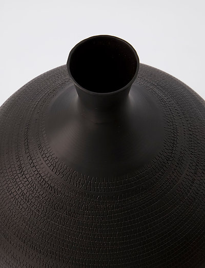 Reena is a large bottle vase that will make your favourite flowers stand out. The light aluminium has been given a dark brown colour while a handmade pattern has been added to the surface. To create a balance to the voluminous shape and detailed pattern, the narrow neck remains smooth. Subtle yet intriguing, use this bottle vase as a focal point on your coffee table or side board with a few flowers or twigs. Combine with the smaller version for an added effect. Variations in the pattern come down to the handmade design and are part of the appeal of this vase.