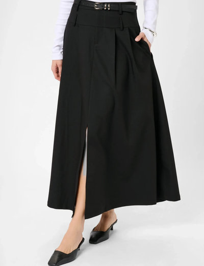 Þetta síða pils er hannað með smáandi A-línuformi og er fjölhæf viðbót við hvaða fataskáp sem er. Hátt mittið skapar ákveðna silúettu, en jakkafataefnið tryggir fágað útlit.