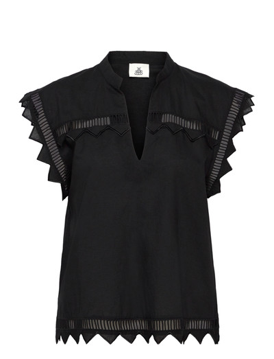 Þessi ermalausa toppur er með skrautkanti meðfram öxlum og faldi, sem bætir við sjónrænu áhugaverðu elementi. V-hálsmálið og slaka sniðið gera hann að þægilegu og stílhreinu vali fyrir hlýtt veður.