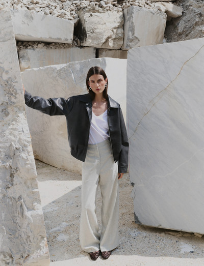 Þessi bomberjakki er með sléttu, nútímalegu sniði og býður upp á nútímalega útfærslu á klassískum stíl. Hönnunin er með kraga með ákveðnu sniði og lúmskt áferðarfallegu yfirborði, sem gerir hana að fjölhæfri viðbót við hvaða fataskáp sem er. Rifaðar upplýsingar á faldi og ermum veita þægilega passform og auka heildarútlitið.
