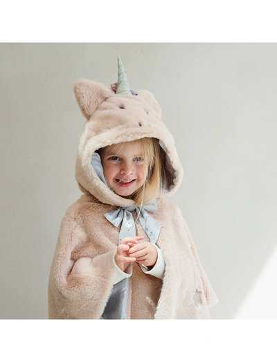 Soft plush cape with a hood with eyes, ears and a unicorn horn. The cape is provided with a star decorated tie bow. Age: 3-8 yrs