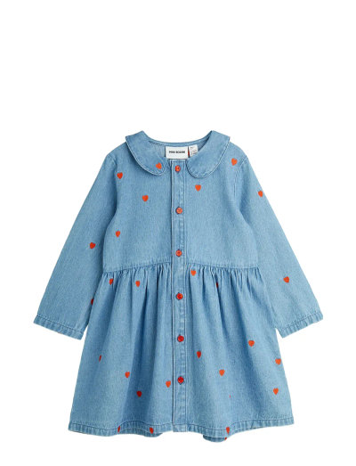 Þessi yndislegi kjóll er með klassískt denim-hönnun. Hann hefur fallegan Peter Pan-kraga og hnappa niður að framan. Kjólurinn er skreyttur með broddaðum hjörtum. Hann hefur þægilegan, afslappandi fit. Þessi kjóll er fullkominn fyrir hvaða tilefni sem er.
