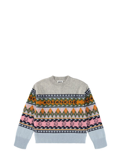 This beautiful multicoloured wool sweater from Molo is inspired by Nordic knitting history. The sweater features beautiful colours and patterns, as well as the text 'Humankind' on the front and back, with small smiling faces all around. With a loose fit and ribbed edges around the neck, sleeves, and waist, this is a stylish and comfortable choice.