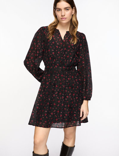 Þessi kjóll með viðkvæmu allsherjarmynstri býður upp á snert af áreynslulausum sjarma. Síðar ermar og mittissaumur skapa smekklegt snið, fullkomið fyrir dag eða kvöld.