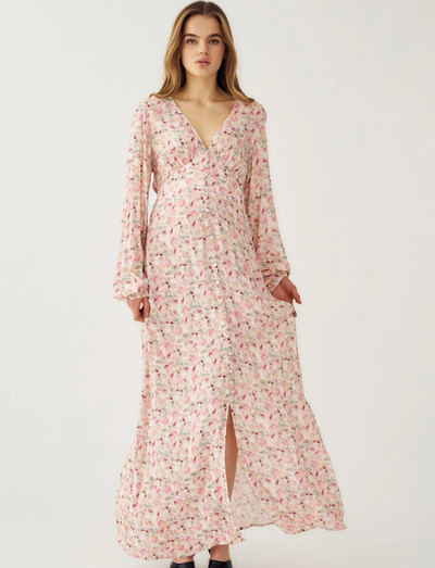 Lilith Maxi Dress er falleg og stílhrein kjóll, fullkominn fyrir hvaða tilefni sem er. Hann er með flötgan V-háls, langar ermar og fljótandi maxiskjört. Kjólarnir eru úr léttum og þægilegum efni sem er fullkomið fyrir hlýtt veður.