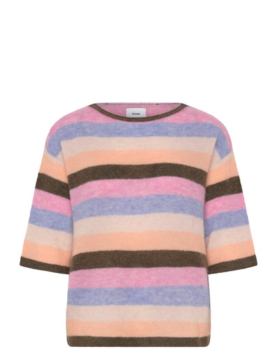 Þessi peysa er með láréttri röndóttri hönnun sem gefur hvaða búningi sem er leikandi blæ. Stuttar ermarnar og kringlótt hálsmálið gera hana að þægilegu og stílhreinu vali til hversdagsnota.