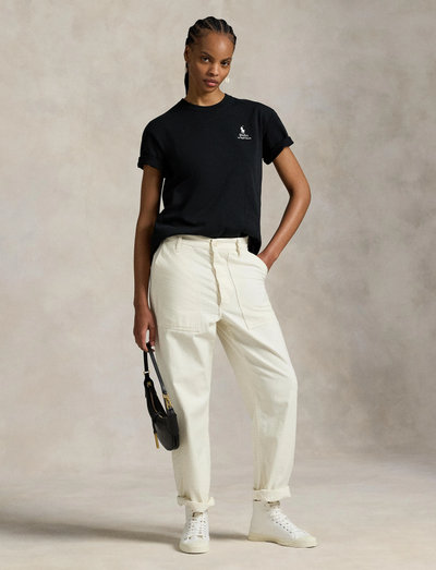 Þessi hálsmálshyrna er úr mjúku bómullarjersey og er með beinu sniði sem er ætlað að ná niður á mjöðm. Hið táknræna lógó er prentað vinstra megin á brjóstinu.