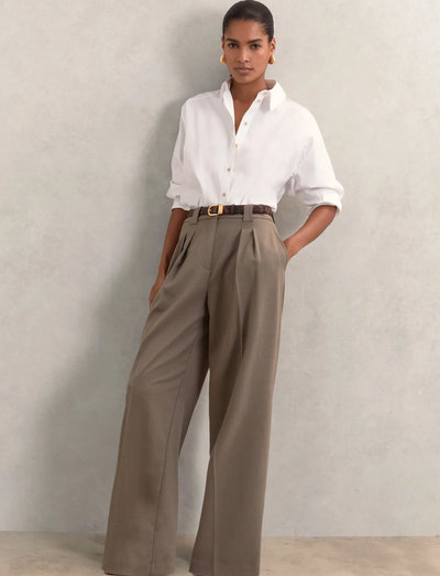 Þessar buxur eru úr úrvals flannelefni og bjóða upp á fágaða silúettu með víðum skálmum og tvöföldum plísum að framan. Hönnunin er fullgerð með pressuðum straumum, hliðarvösum og öruggri krókaa-og-slárfestingu.