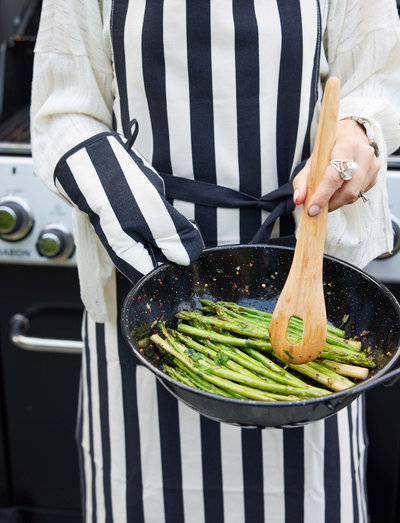Protect your clothes and hands with Aron from Sagaform. Aron apron together with Aron barbeque glove is the only outfit you need when cooking, regardless if it’s indoors or outdoors. Aron is designed in close-to-nature colours in combination with Sagaform’s classic stripes. The material is sustainable and durable and made of recycled cotton and recycled polyester. Aron apron is available in a blue/white and a black/white version, both have a front pocket. A favourite of both the grill master and the queen of the kitchen.