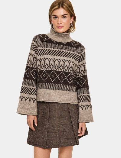 Þessi rúllukragapeysa með áberandi mynstri býður upp á bæði hlýju og stíl. Slaka sniðið tryggir þægindi, en háa hálsmálið veitir auka notalegheit á kaldari dögum.