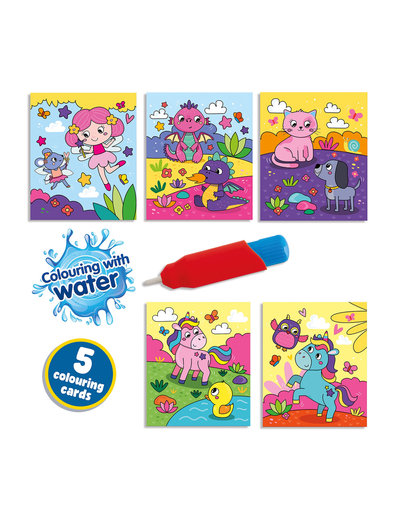 Discover the magic of colouring with water and paint the white areas on each book page using a magic brush for mess-free colouring fun.
