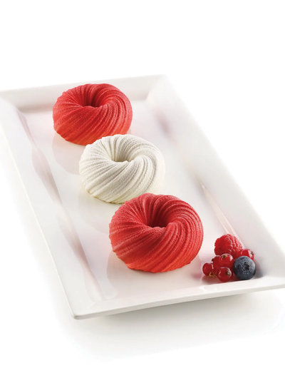 Discover the silicone mold Mini Intreccio from Silikomart! Create delicate miniature desserts with this unique shape, ideal for mousses, jellies and pies. Each mold has a diameter of 75mm and a height of 35mm, and comes in a set of 6. Made from food grade silicone, it can withstand temperatures from -60°C to 230°C.