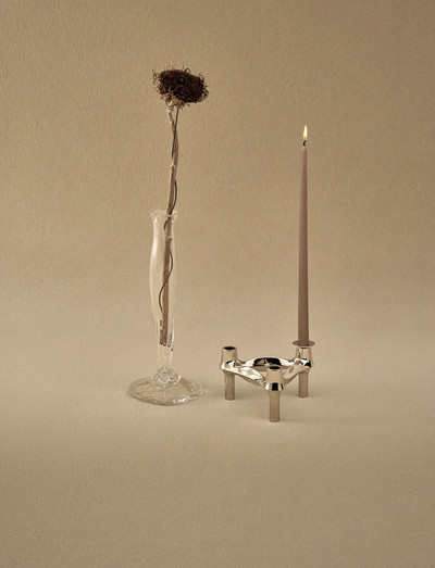 The brushed chrome edition is a modern and minimalistic addition to the BMF collection. The brushed edition stands out for its subtle elegance and refined finish, characterized by fine, linear strokes that give the surface a matte, satin-like texture. The BMF candle holder was launched by the BMF company in 1970's and produced until 1985. Today, the BMF candle holder has joined the STOFF Nagel collection to continue the vision of rediscovering iconic design.