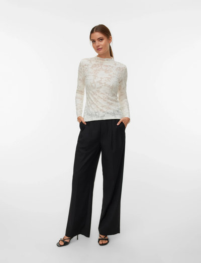 Þessi toppur býður upp á endalausa stílmöguleika og er fjölhæf viðbót við hvaða fataskáp sem er. Hátt hálsmálið og þrönga sniðið skapa fágaða silúettu, á meðan viðkvæmu blúndu smáatriðin bæta við snert af glæsileika. Langar ermar gera hann fullkominn til að klæða sig í lög eða vera í hann einan.