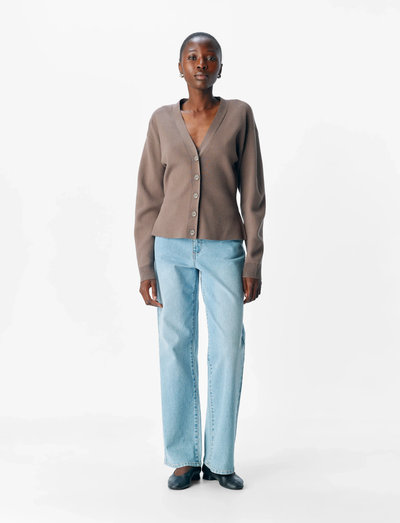 Featuring a V-neck and button fastening, this knit cardigan offers versatile styling options. Wear it buttoned up for a preppy look or open for a more relaxed feel. The volume sleeves add a touch of elegance to this slim-fit piece, making it a reliable choice for any season.