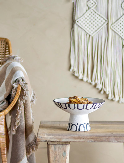 "Bloomingville" "Mayotte" dubuo ant pjedestalo - akį traukiantis matinės baltos glazūros dubuo ant stovo su šauniu grafiniu rankomis tapytu juodu raštu. Puikiai tinka dekoruoti arba pridėkite servetėlę ir naudokite jį vaisiams ar daržovėms. Kadangi jis yra rankomis tapytas, kiekvienas dubenėlis skirsis ir bus unikalus.
