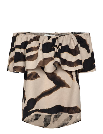 Šis Copenhagen Muse off-shoulder palaidinukė pasižymi stilingu zebro raštu ir raukšlėtu iškirpte. Palaidinukė pagaminta iš minkšto ir patogaus audinio, todėl ji puikiai tinka bet kokiai progai.