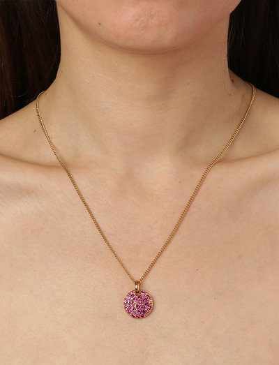 Šį kaklo papuošalą apibrėžia žavinga daugialypių kristalų gama, suteikianti žavesio bet kokiam įvaizdžiui. Apvalus, disko formos pakabukas pagamintas iš padengto žalvario, jame įspūdingai išdėstyti įvairaus dydžio kristalai, kurie visi yra ant aukso spalvos pagrindo. Šis rankų darbo, be nikelio, danų dizainas tikrai patrauks dėmesį.