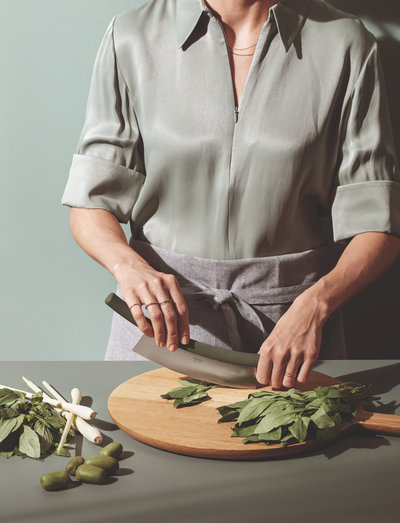 Šis pusmėnulio formos funkcinis peilis palengvina daržovių pjaustymą. Pavyzdžiui, paprasčiausiai perbraukite išlenkta geležte per žoleles. Peilis turi tvirtą ir patogią rankeną abiejuose galuose.