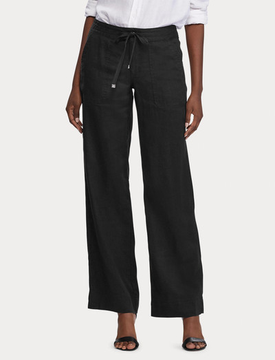 Šios plačios kelnės pasiūtos iš lengvo lino audinio, todėl užtikrina išskirtinį komfortą ir stilių šiltesniu oru. Vidutinio aukščio modelis turi elastinį raištelį juosmens srityje, kuris užtikrina puikų prigludimą, o metaliniai raištelių galai suteikia rafinuotumo. Užsiūtos kišenės priekyje ir užsiūtos kišenės su sagomis nugaroje pabrėžia kasdienišką, bet rafinuotą išvaizdą.