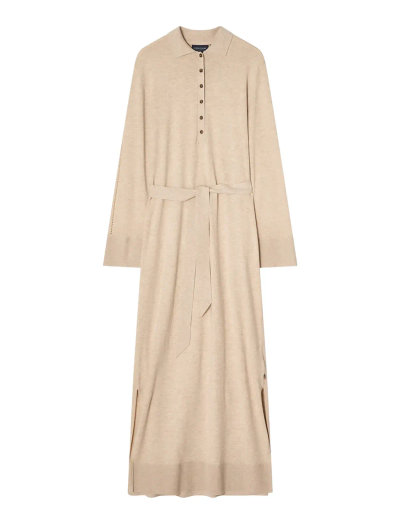 Ši megzta suknelė su rafinuota polo apykakle ir savarankišku diržu sukuria elegantišką siluetą. Ilgos rankovės ir maksimalus ilgis suteikia jai elegancijos, o šoniniai skeltukai užtikrina judėjimo laisvę.