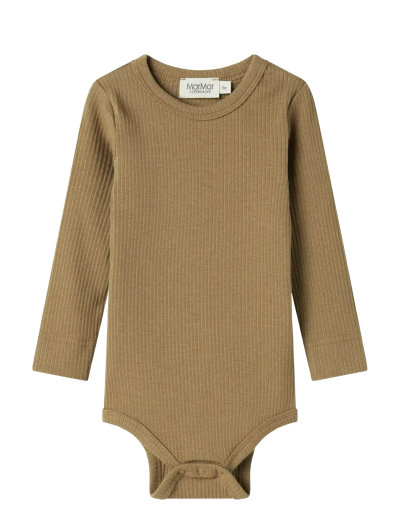 Plain long-sleeved bodysuit, with snap buttons at the crotch for easy changing