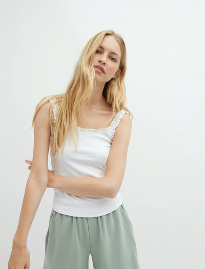 Šis be rankovių viršus turi subtilią nėrinių apdailą aplink iškirptę ir petnešėles. Tai universalus drabužis, kurį galima apsirengti tiek kasdienai, tiek ypatingoms progoms.