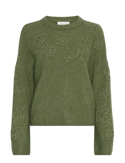 Subtilūs gėlių siuvinėjimai suteikia elegancijos šiam jaukiam megztiniui. Apvalaus kaklo dizainas ir laisvas kirpimas leidžia patogiai ir stilingai dėvėti kasdien.