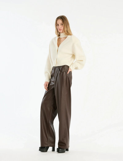 Šis megztas kardiganas pasižymi unikaliu siluetu, suteikiančiu klasikinam stiliui modernumo. Dizainas apima aukštą apykaklę ir atvirą priekį, sukuriantį universalų drabužį, kurį galima stilizuoti įvairiais būdais. Minkšta megzta konstrukcija užtikrina patogų prigludimą, todėl idealiai tinka dėvėti sluoksniais arba atskirai.