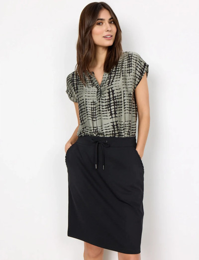 Šis sijonas pagamintas iš perdirbto poliesterio mišinio, todėl yra ir patogus, ir sąmoningas pasirinkimas. Jis turi elastinę juosmens juostą su raišteliais, kad būtų galima reguliuoti prigludimą, kurią papildo žavios raukinių detalės prie kišenių. Universalus ir lengvai dėvimas kasdienis drabužis.