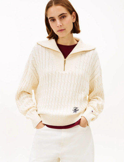 Šį megztinį su užtrauktuku iki pusės apibrėžia nesenstantis pynių raštas, todėl jis yra universalus bet kurio garderobo papildinys. Ilgomis rankovėmis modelis turi klasikinę apykaklę ir subtilią logotipo detalę, suteikiančią rafinuotą, bet kartu ir kasdienišką išvaizdą.