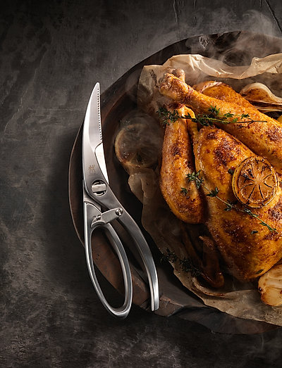 Jei mėgstate traškią keptą antį ir gardžią keptą vištą, tuomet "Twin Select" paukštienos žirklės yra idealus virtuvės įrankis. šios žirklės padės jums ruošti ir porcijuoti visų rūšių paukštieną. 23,5 cm ilgio žirklės tinka vištienai, ančiai, žąsiai ir net kalakutui. kaltinės žirklės pagamintos iš specialaus nerūdijančiojo plieno ir turi dantytą pjovimo briauną, todėl patikimai apsaugo nuo slydimo pjaustant. ergonomiška rankena labai gerai priglunda prie rankos, o idealus svertas užtikrina efektyvų darbą. todėl su paukštienos žirklėmis galite ilgai dirbti, nepavargdama ranka. dėl integruoto kaulų smulkintuvo galite patikimai perpjauti sausgysles ir kaulus, o dantytas aštrus kraštas užtikrina švarius pjūvius. todėl galite lengvai porcijuoti paruoštus patiekti paukštienos gabalėlius ir padaryti juos labai apetitiškus. Twin Select paukštienos žirklės suprojektuotos su spyruokle viduje. todėl ši negali tiesiog iššokti. be to, apsauginė juosta neleidžia žirklėms atsitiktinai atsidaryti ir sumažina susižalojimo riziką. po darbo žirkles galite išardyti naudodami nuimamą nagą, kad būtų lengva jas išvalyti.