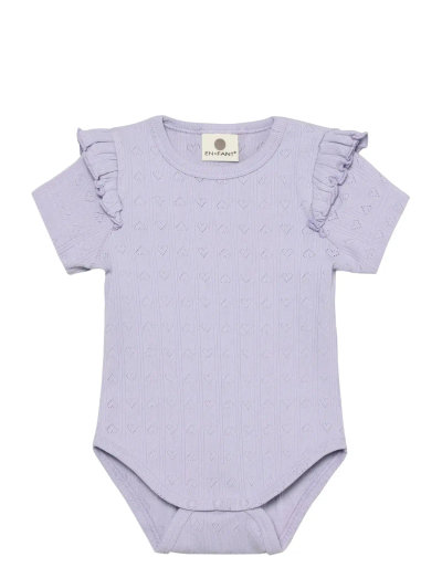 Short sleeved body from EN FANT. This body has flounce at the shoulder and is made in a pointelle quality. There is a cute pattern in the pointelle. The body can be opened with practical snaps at the shoulder and between the legs.