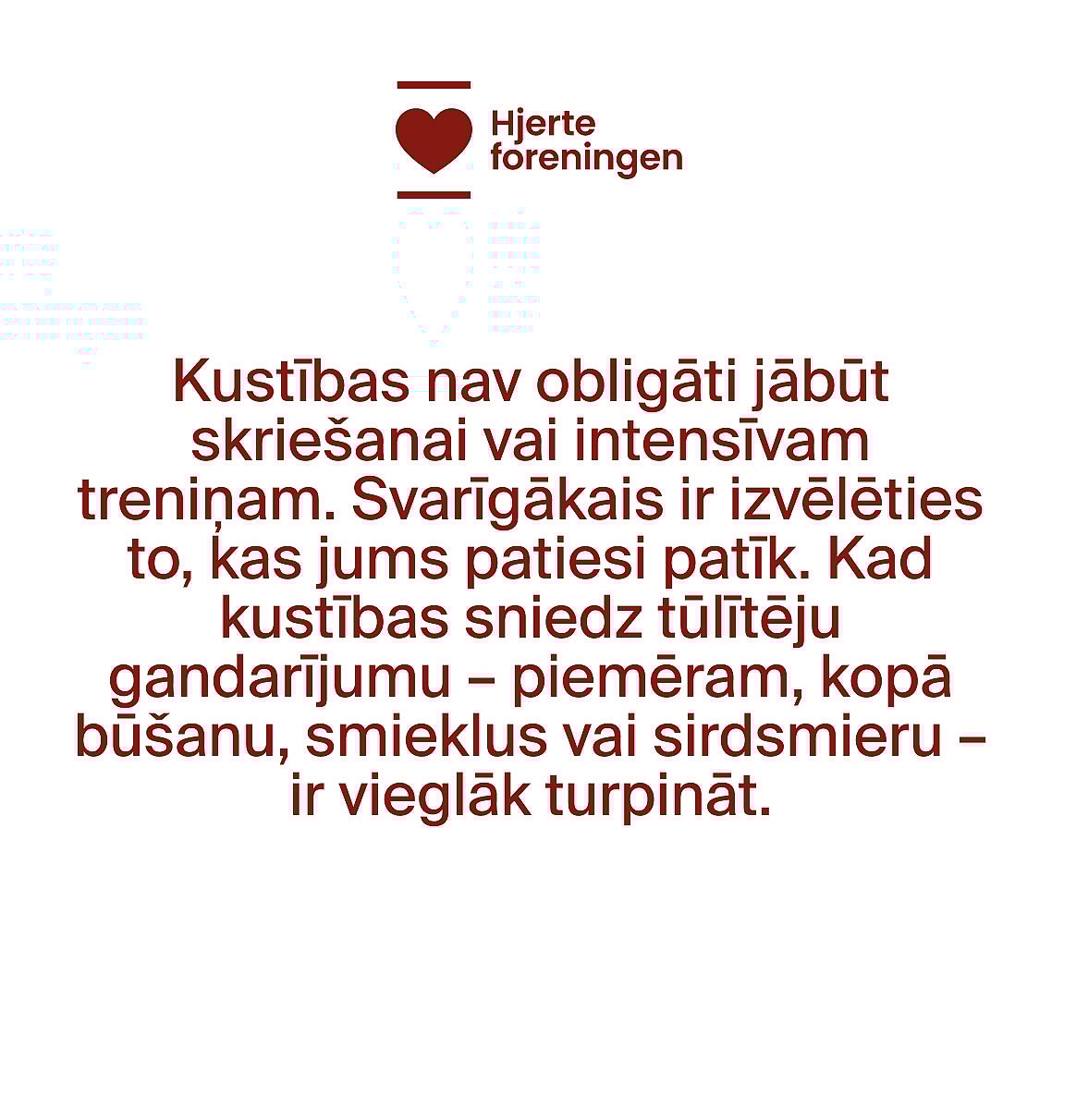 Boozt mērķis ir iedvesmot dzīvesveidu, kurā mazas izvēles rada lielas pārmaiņas. Sadarbībā ar Danish Heart Foundation mēs vēlamies sirds veselību padarīt par daļu no ikdienas dzīves. Mēs vēlamies atvieglot mūsu klientu izvēli, ņemot vērā sirds veselību — ar iedvesmu, zināšanām un mazām darbībām, kas veicina veselīgāku dzīvi. Mēs vēlamies atbalstīt sirds veselības jautājumus un pievērst uzmanību vienam no svarīgākajiem ķermeņa orgāniem. Visbeidzot, mēs vēlamies dzīvē iedvest vairāk dzīvības.