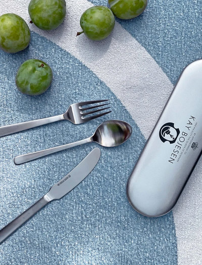 Kay Bojesen's travel cutlery is packed in a small practical steel box, suitable for putting in your bag, pocket or rucksack. That way you always have your favorite cutlery at hand when a meal needs to be consumed on the go or at work.