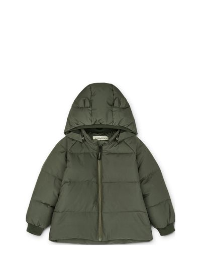 POLLE PUFFER JACKET BIONIC FINISH® ECO Warm down baby jacket Lightweight and insulated comfort Horizontal quilt stitching Detachable hood with animal details Ribbed neckline and sleeve Zip-up front with YKK zipper