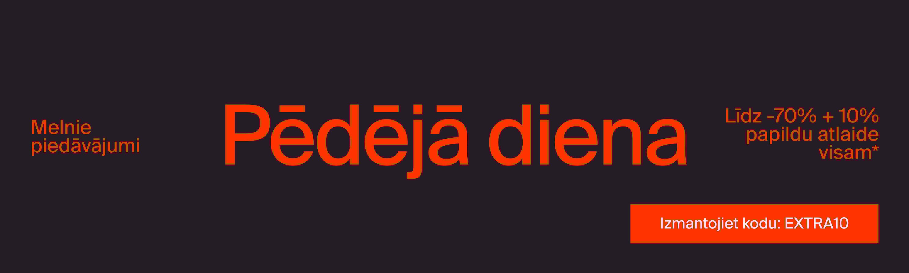 *TIEŠI TAGAD! Pērkot divas vai vairāk preces. Derīgs, iepērkoties par vismaz 69€. Kuponu pie izrakstīšanas nevar summēt ar citiem kodiem. Atsevišķi zīmoli ir izslēgti. Izmantojiet kodu: EXTRA10